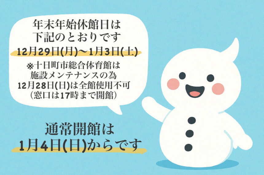12月28日(日)は施設メンテナンスの為全館使用不可 ※窓口は開館(17:00まで)