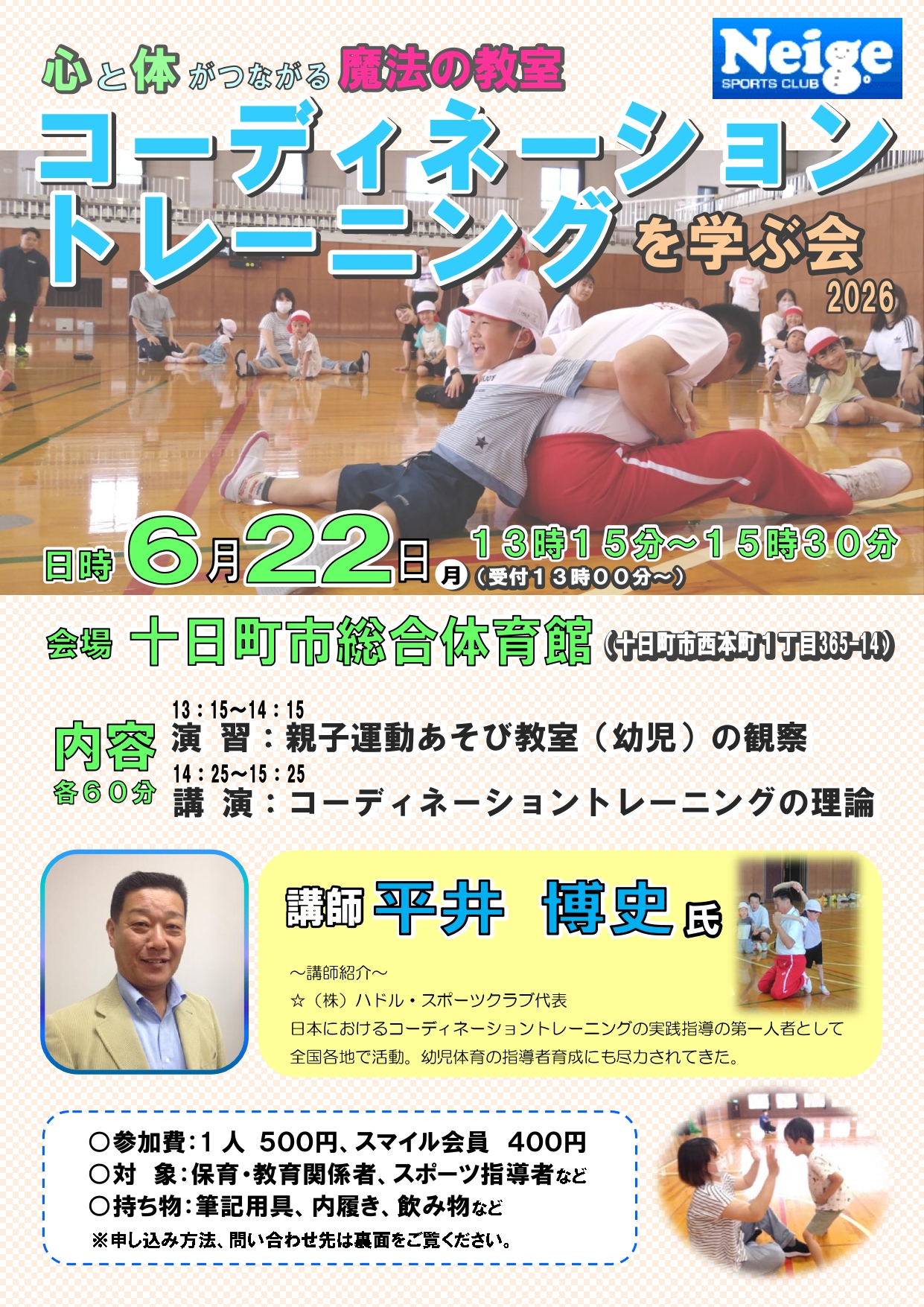 今年もコーディネーショントレーニングの実践指導の第一人者、(株)ハドル・スポーツクラブ代表の平井博史氏を講師に「コーディネーショントレーニングを学ぶ会2026」を開催します。