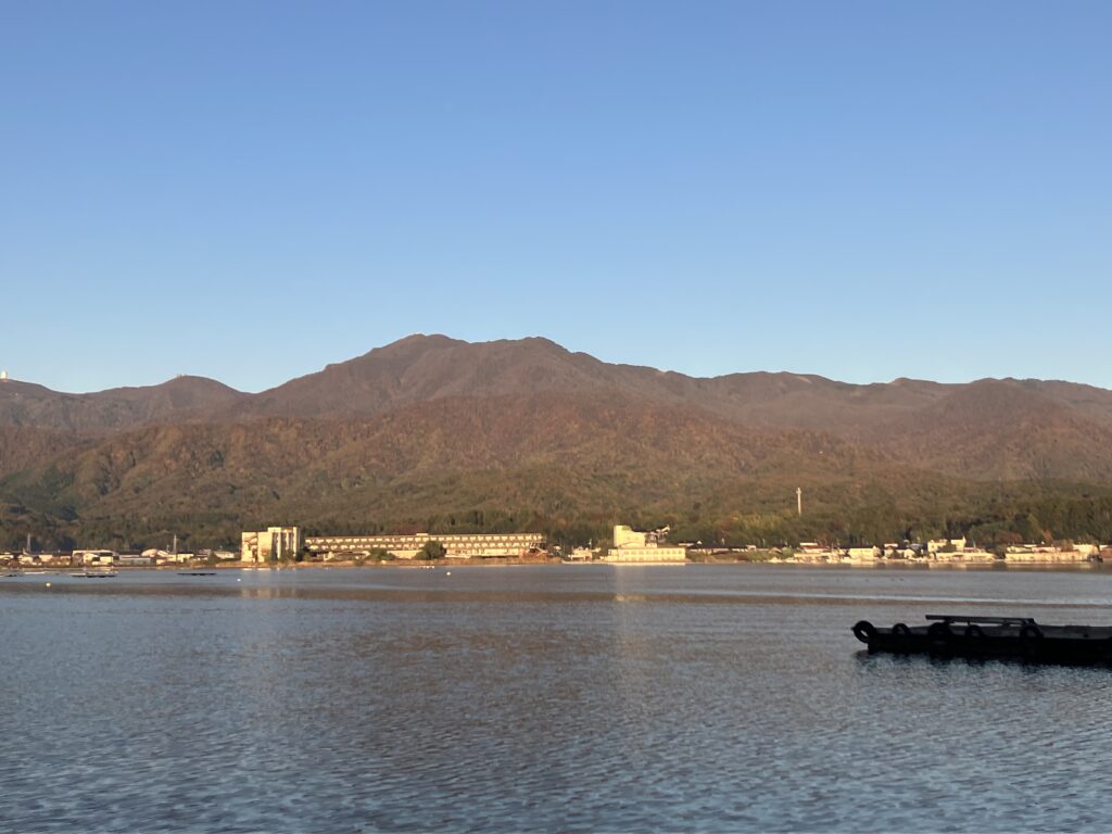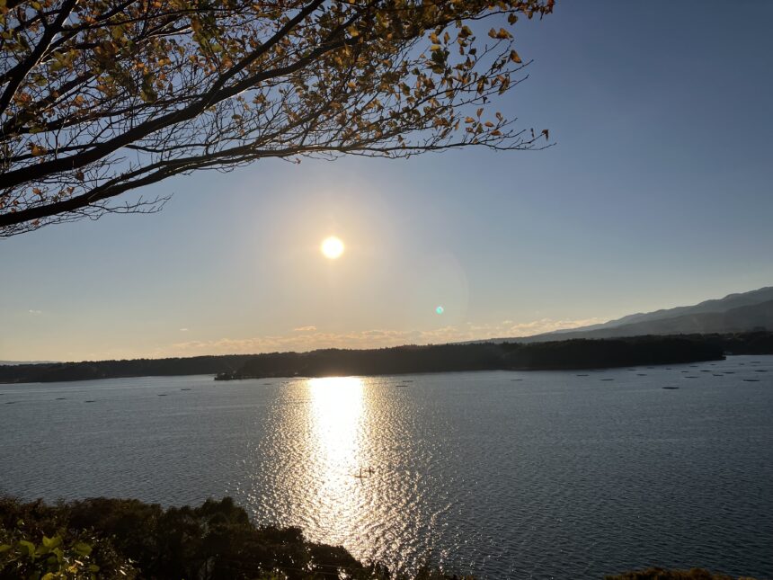 今月は、展望台から島にある湖を夕方と朝に見ました。