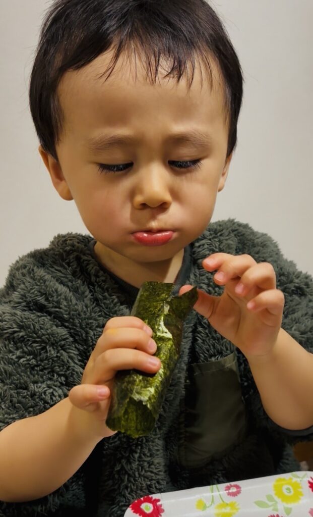 当日、手巻き寿司パーティでいくらを初めて食べた息子。