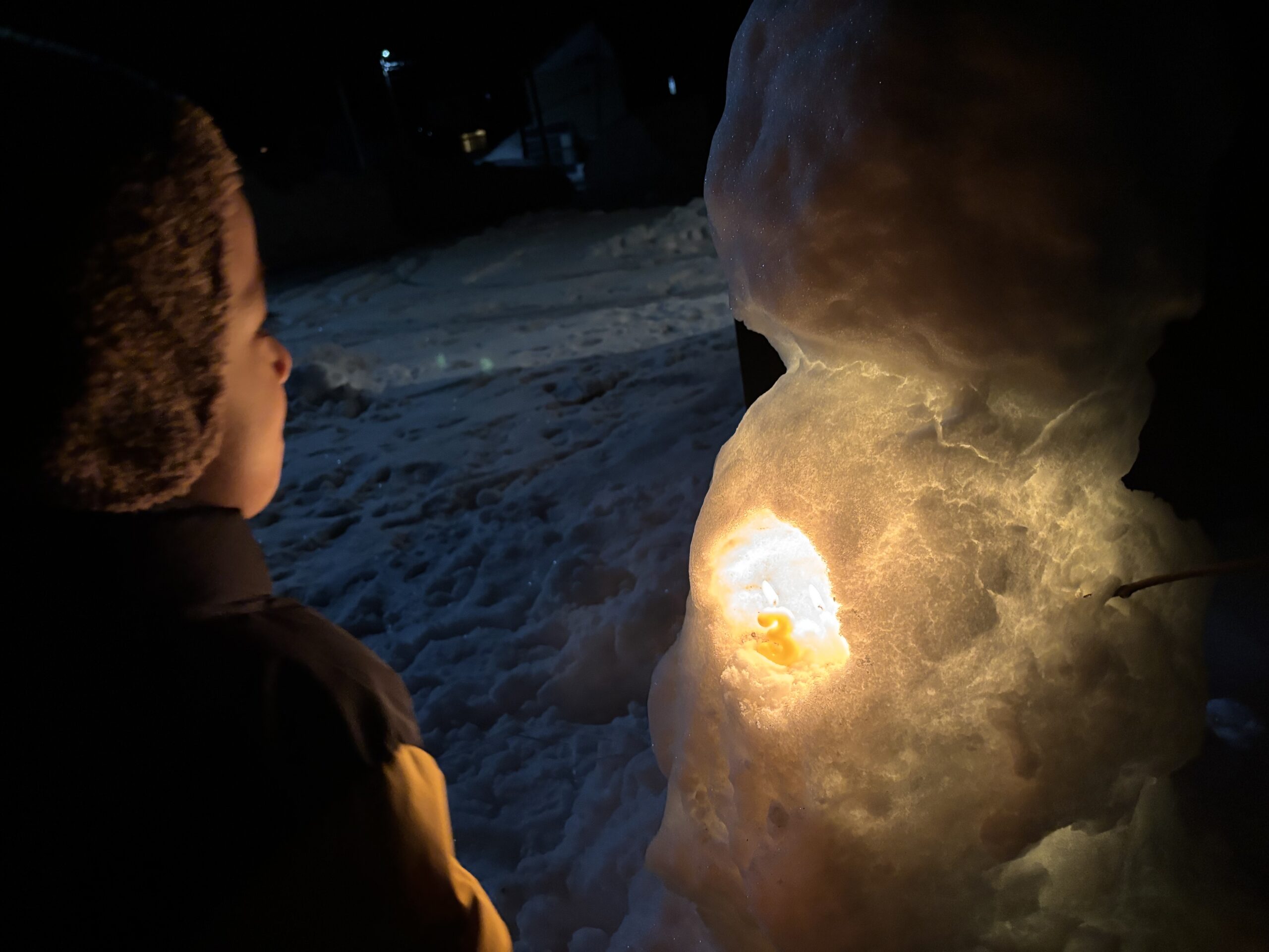 誕生日ケーキで使った【3】のろうそくは、昼間つくった雪だるまに灯しました。